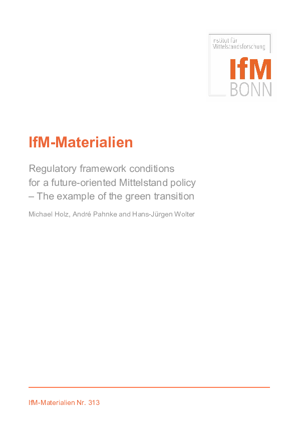 Holz, M.; Pahnke, A.; Wolter, H.-J. (2025): Ordnungspolitische Rahmenbedingungen für eine zukunftsorientierte Mittelstandspolitik – Das Beispiel der grünen Transformation, in: IfM Bonn: IfM-Materialien Nr. 313, Bonn.