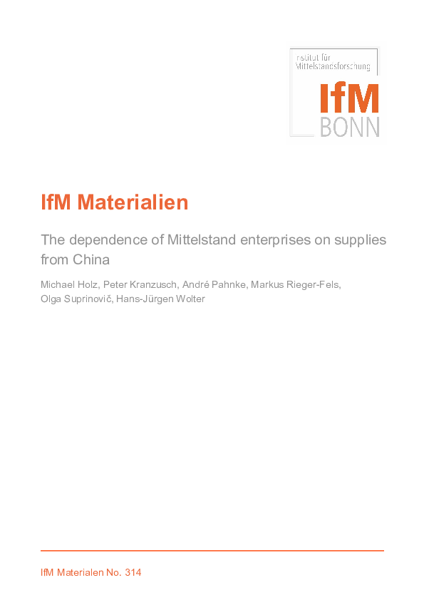 Holz, M.; Kranzusch, P.; Pahnke, A.; Rieger-Fels, M.; Suprinovič, O.; Wolter, H.-J. (2026): Abhängigkeit des Mittelstands von Zulieferungen aus China, in IfM Bonn: IfM Materialien Nr. 314, Bonn.