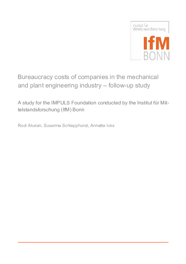 Akalan, R.; Schlepphorst, S.; Icks, A. (2025): Bürokratiekosten von Unternehmen aus dem Maschinen- und Anlagenbau – Folgestudie, im Auftrag der Stiftung für den Maschinenbau, den Anlagenbau und die Informationstechnik, Bonn.
