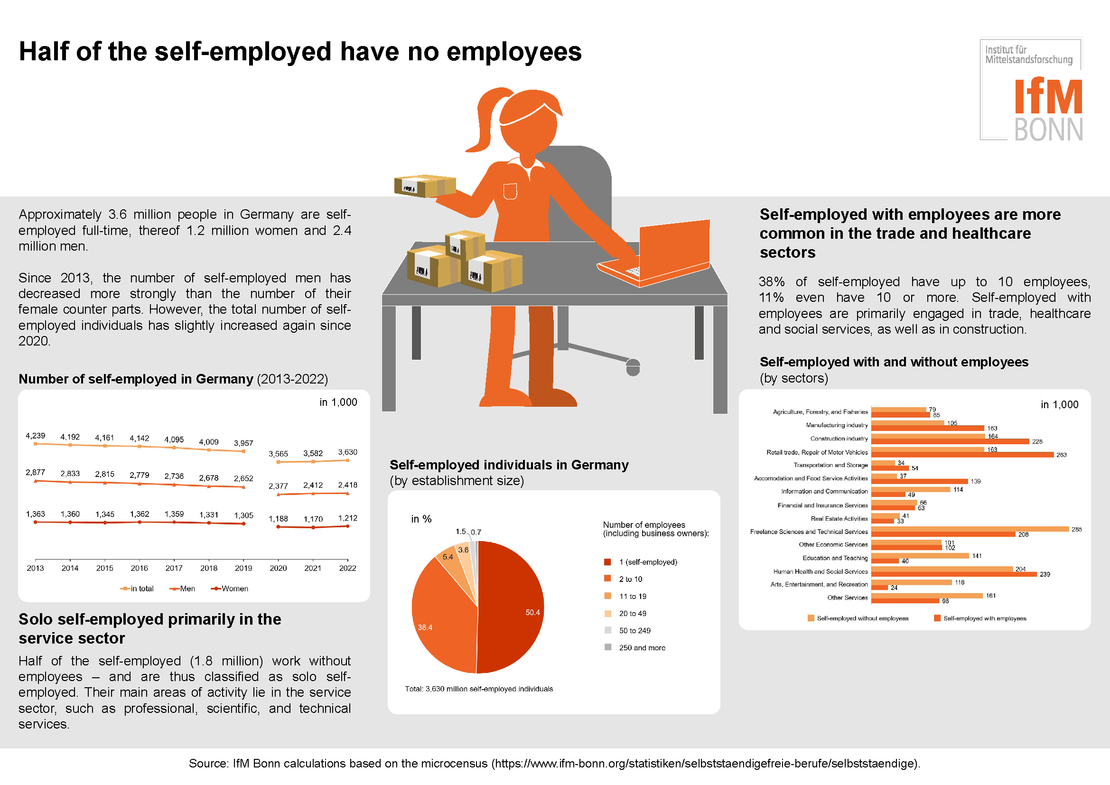 The researchers at IfM Bonn compile numerous statistical data on the Mittelstand in general as well as on small and Medium-sized enterprises (SMEs), the self-employed and family businesses in particular regularly.