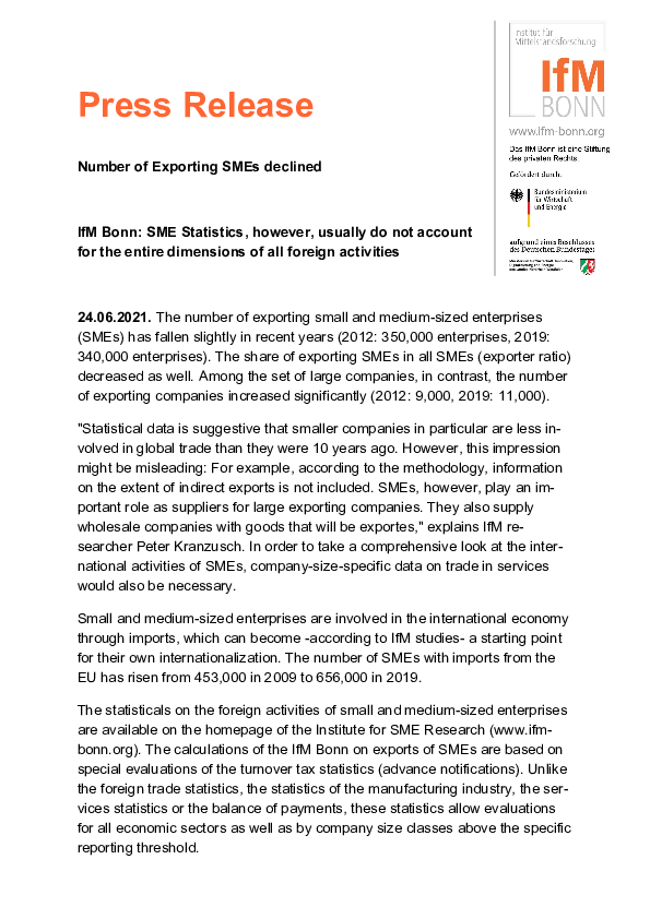 Mittelstand - Themes The IfM Bonn presents quantitative data on small and medium-sized enterprises (SME definition of the IfM Bonn) and large companies on the following pages. The data is updated…