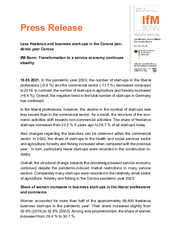 The coronavirus pandemic has a significant impact on economic activity in Ger-many. In view of the poor business prospects, the number of market entries (start-ups) should have decreased and the number of exits should have increased.