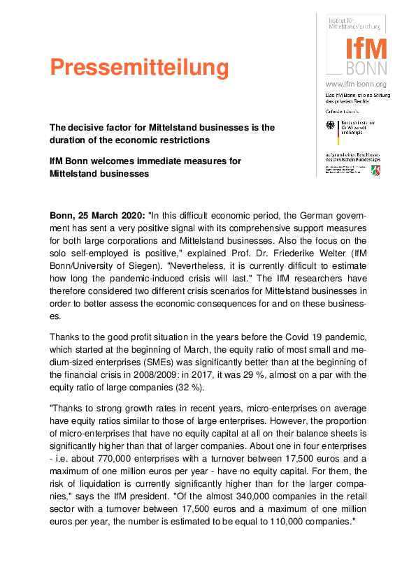 In 2014, 2017 and 2020, the IfM Bonn surveyed both entrepreneurs and experts on the challenges facing the Mittelstand in Germany as part of its Future Panel. These surveys will be continued at regular intervals.
