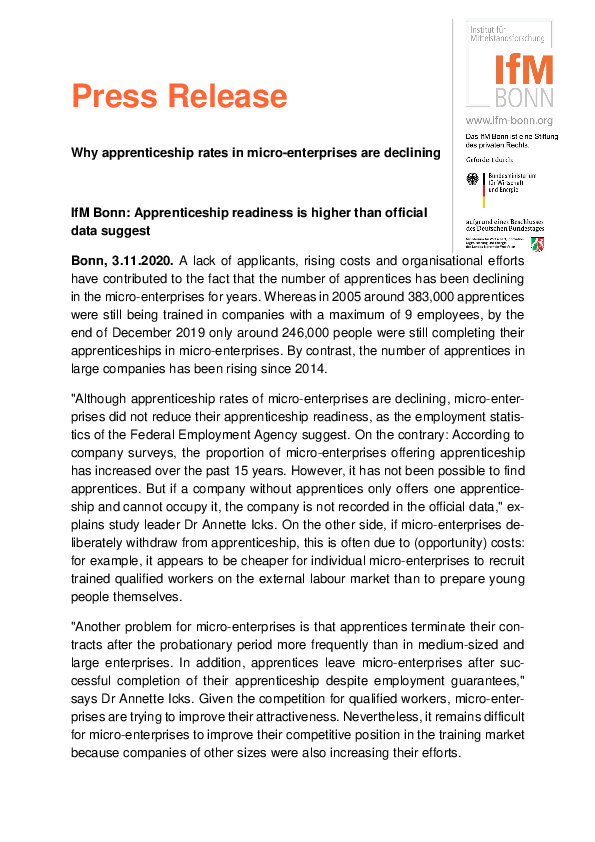 Developments on the apprenticeship market show not only a declining number of apprentices in establishments with less than ten employees, but also that fewer and fewer micro-enterprises are offering apprenticeships at all.