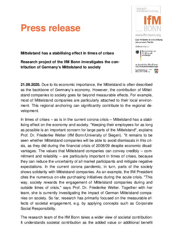 External publication | 2020 Data for Mittelstand Companies in Germany at the IfM Bonn