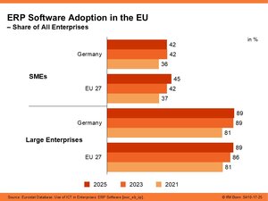 Around four in ten SMEs in Germany (42%) used Enterprise Resource Planning (ERP) software in 2025 to plan and manage their business processes. This is close to the EU average (45%). Large enterprises in Germany, however, use this software to digitally connect their company departments far more frequently (89%), which also aligns with the EU average. Compared with previous years, the use of ERP systems has stagnated in both SMEs and larger companies.