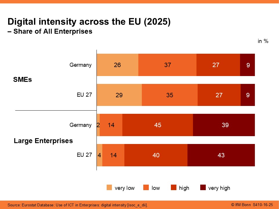In 2025, more than one in three SMEs in Germany had a “high” to “very high” digital intensity. Very high digital intensity means that companies implement at least 10 out of 12 surveyed digitalization measures, while high intensity corresponds to 7 to 9 measures (see the data source notes for further information). German SMEs are largely similar in this regard to their EU counterparts. Nevertheless, digital intensity increases with company size: around 84% of large enterprises in Germany have a (very) high digital intensity (83% EU-wide).