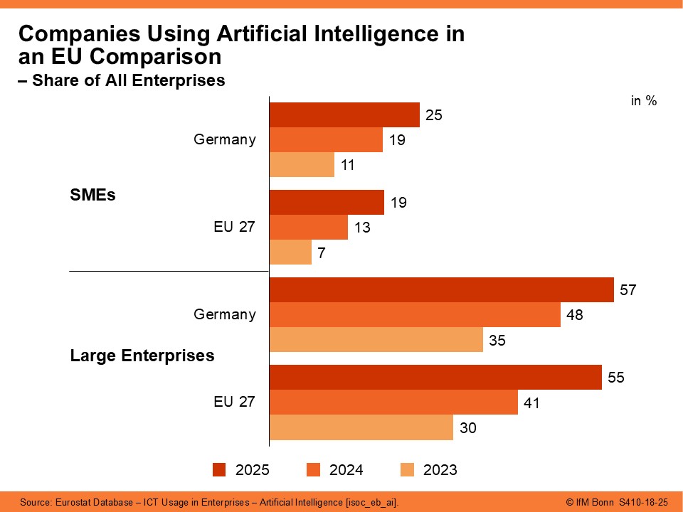 The use of artificial intelligence (AI) has gained significant momentum in recent years. In 2025, around one in four SMEs in Germany used AI applications – not only more than the EU average (19%), but also a clear increase compared to the previous year (19%). However, large enterprises in Germany continue to use AI far more frequently than SMEs. Their adoption rate stands at 57%, slightly above the EU average (55%). As a result, the gap in AI usage between SMEs and large companies continues to widen.