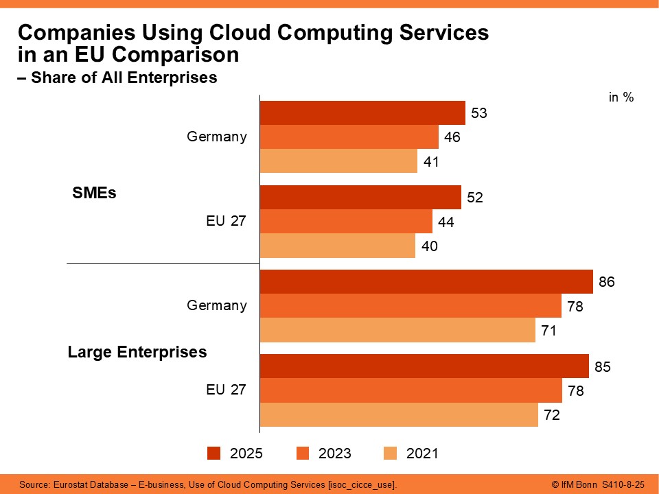 In 2025, SMEs in Germany made significantly greater use of paid cloud computing services than in 2021, with an increase of 12 percentage points. This places German SMEs slightly above the EU average.