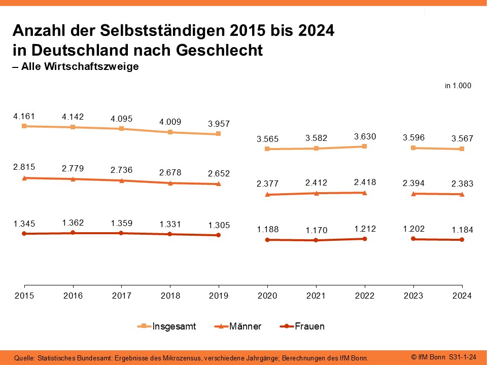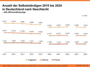 Im Jahr 2024 gab es rund 2,4 Millionen selbstständige Männer und rund 1,2 Millionen selbstständige Frauen in Deutschland. Frauen stellten somit rund ein Drittel aller Selbstständigen. Insgesamt betrachtet, hat zwischen 2015 und 2024 die Anzahl der selbstständigen Männer stärker abgenommen als die der selbstständigen Frauen.