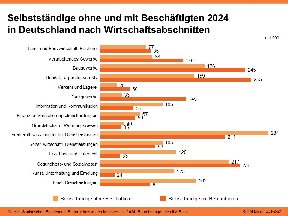 Rund 1,8 Millionen oder 50,6% der Selbstständigen haben keine Beschäftigten und gelten damit als Soloselbstständige. In rund 38% aller Betriebe von Selbstständigen waren – einschließlich Betriebsinhaber/Betriebsinhaberin – 2 bis 10 Mitarbeiter tätig. Größere Betriebe führten rund 11% aller Selbstständigen.