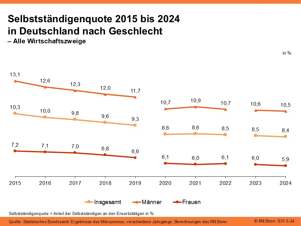 Im Jahr 2024 betrug die Selbstständigenquote, d.h. der Anteil der Selbstständigen an allen Erwerbstätigen, 8,4%. Dabei lag die Quote der Männer mit 10,5% über der der Frauen mit 5,9%. Die Selbstständigenquote sinkt bereits seit 2015 – bei den Männern etwas stärker als bei den Frauen. Ob der überdurchschnittlich starke Rückgang der Selbstständigenquote zwischen 2019 und 2020 realwirtschaftliche Ursachen hatte oder methodisch bedingt war, kann zum jetzigen Zeitpunkt nicht abschließend geklärt werden. Neben den pandemiebedingten Beeinträchtigungen des Wirtschaftslebens, aufgrund derer eine Reihe von Selbstständigen ihre Tätigkeit nicht ausüben konnten, dürfte beispielsweise auch die Wiedereinführung der Meisterpflicht in einigen Gewerken zu Beginn des Jahres 2020 zum Rückgang der Selbstständigenquote bei den Männern beigetragen haben.