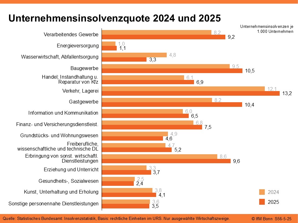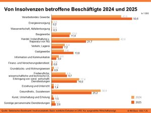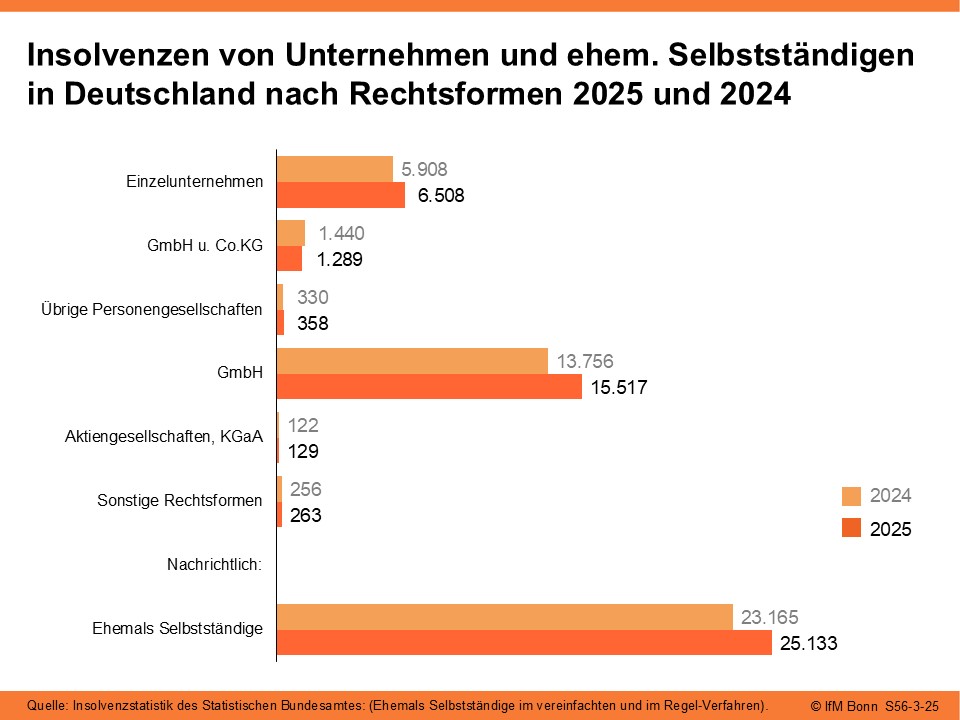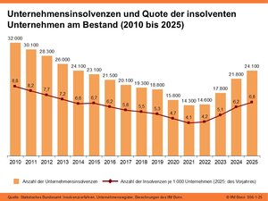 Die Anzahl der Insolvenzen je 1.000 Bestandsunternehmen gemäß Unternehmensregister ist von 6,2 in 2024 auf 6,8 gestiegen. Neben den 24.064 Unternehmen stellten mehr als 25.000 ehemals Selbstständige, die Schulden aus der früheren selbstständigen Tätigkeit haben, einen Insolvenzantrag.