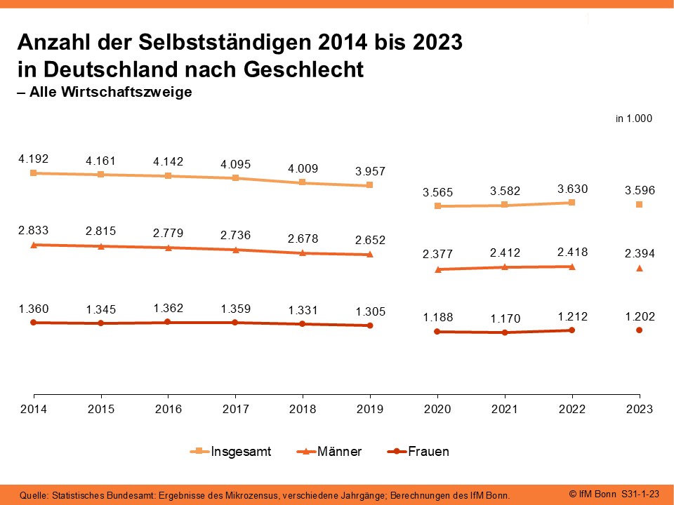 Im Jahr 2023 gab es rund 2,4 Millionen selbstständige Männer und rund 1,2 Millionen selbstständige Frauen in Deutschland. Frauen stellten somit rund ein Drittel aller Selbstständigen. Insgesamt betrachtet, hat zwischen 2013 und 2023 die Anzahl der selbstständigen Männer stärker abgenommen als die der selbstständigen Frauen.