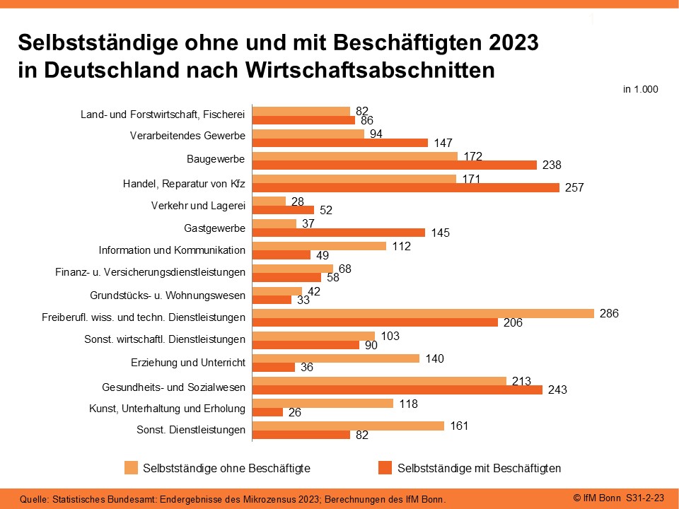 Rund 1,8 Millionen oder 51,1% der Selbstständigen haben keine Beschäftigten und gelten damit als Soloselbstständige. In rund 38% aller Betriebe von Selbstständigen waren – einschließlich Betriebsinhaber/Betriebsinhaberin – 2 bis 10 Mitarbeiter tätig. Größere Betriebe führten rund 11% aller Selbstständigen.