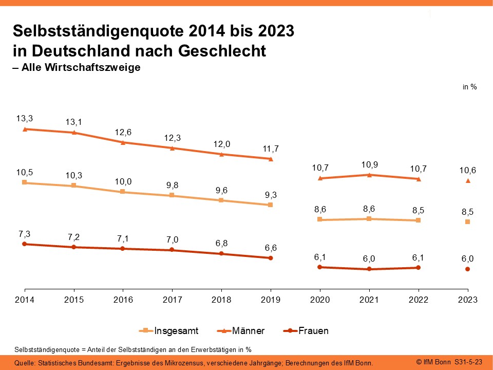 Im Jahr 2023 betrug die Selbstständigenquote, d.h. der Anteil der Selbstständigen an allen Erwerbstätigen, 8,5%. Dabei lag die Quote der Männer mit 10,6% über der der Frauen mit 6,0%. Die Selbstständigenquote sinkt bereits seit 2014 – bei den Männern etwas stärker als bei den Frauen. Ob der überdurchschnittlich starke Rückgang der Selbstständigenquote zwischen 2019 und 2020 realwirtschaftliche Ursachen hatte oder methodisch bedingt war, kann zum jetzigen Zeitpunkt nicht abschließend geklärt werden. Neben den pandemiebedingten Beeinträchtigungen des Wirtschaftslebens, aufgrund derer eine Reihe von Selbstständigen ihre Tätigkeit nicht ausüben konnten, dürfte beispielsweise auch die Wiedereinführung der Meisterpflicht in einigen Gewerken zu Beginn des Jahres 2020 zum Rückgang der Selbstständigenquote bei den Männern beigetragen haben.