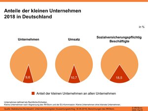 Im Jahr 2018 zählten gemäß der KMU-Definition des IfM Bonn und der KMU-Definition der EU-Kommission rund 332.800 Unternehmen - definiert als Rechtliche Einheiten - zu den kleinen Unternehmen (9,6% aller Unternehmen). Sie erwirtschafteten rund 746,1 Milliarden Euro (10,7% aller steuerbaren Umsätze aus Lieferungen und Leistungen) und hatten rund 5,72 Millionen sozialversicherungspflichtig Beschäftigte (18,5% aller sozialversicherungspflichtig Beschäftigten).