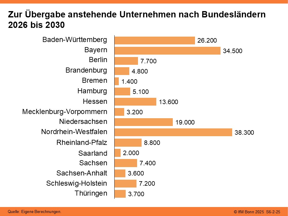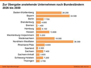 Nach aktuellen Schätzungen steht im Zeitraum von 2026 bis 2030 in 186.000 Familienunternehmen die Übergabe an. Damit stagniert die Zahl der Übergaben gegenüber der vorangegangenen Schätzung, trotz der zunehmenden Alterung der Unternehmensinhaberinnen und -inhaber. Ursächlich hierfür ist eine Verschlechterung der wirtschaftlichen Situation der Unternehmen, die eine Übernahme aus Sicht der Nachfolgeinteressierten weniger attraktiv macht.