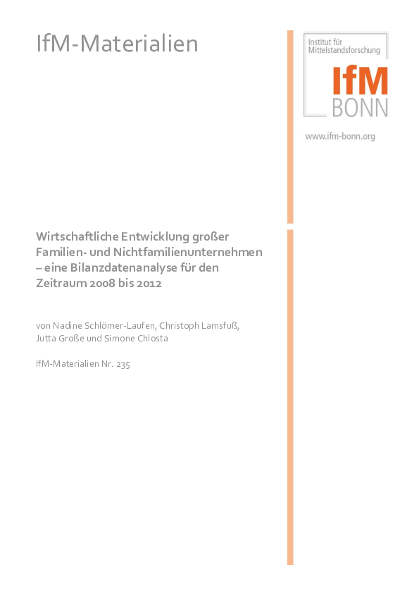 Schlömer-Laufen, N.; Lamsfuß, C.; Große, J.; Chlosta, S. (2014): Wirtschaftliche Entwicklung großer Familien- und Nichtfamilienunternehmen – eine Bilanzdatenanalyse für den Zeitraum 2008 bis 2012, IfM Bonn: IfM-Materialien Nr. 235, Bonn.