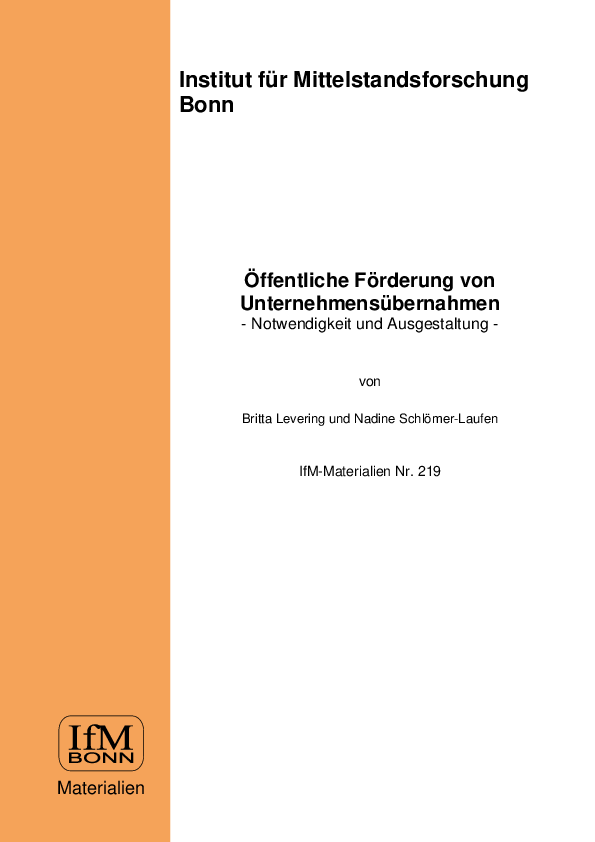 Levering, B.; Schlömer-Laufen, N. (2012): Öffentliche Förderung von Unternehmensübernahmen – Notwendigkeit und Ausgestaltung, in: IfM Bonn (Hrsg.): IfM-Materialien Nr. 219, Bonn.